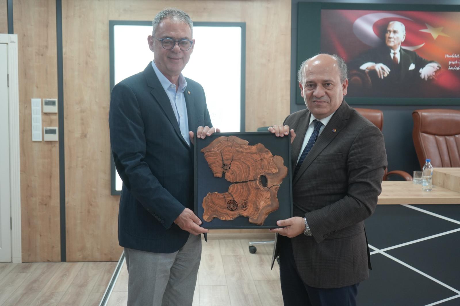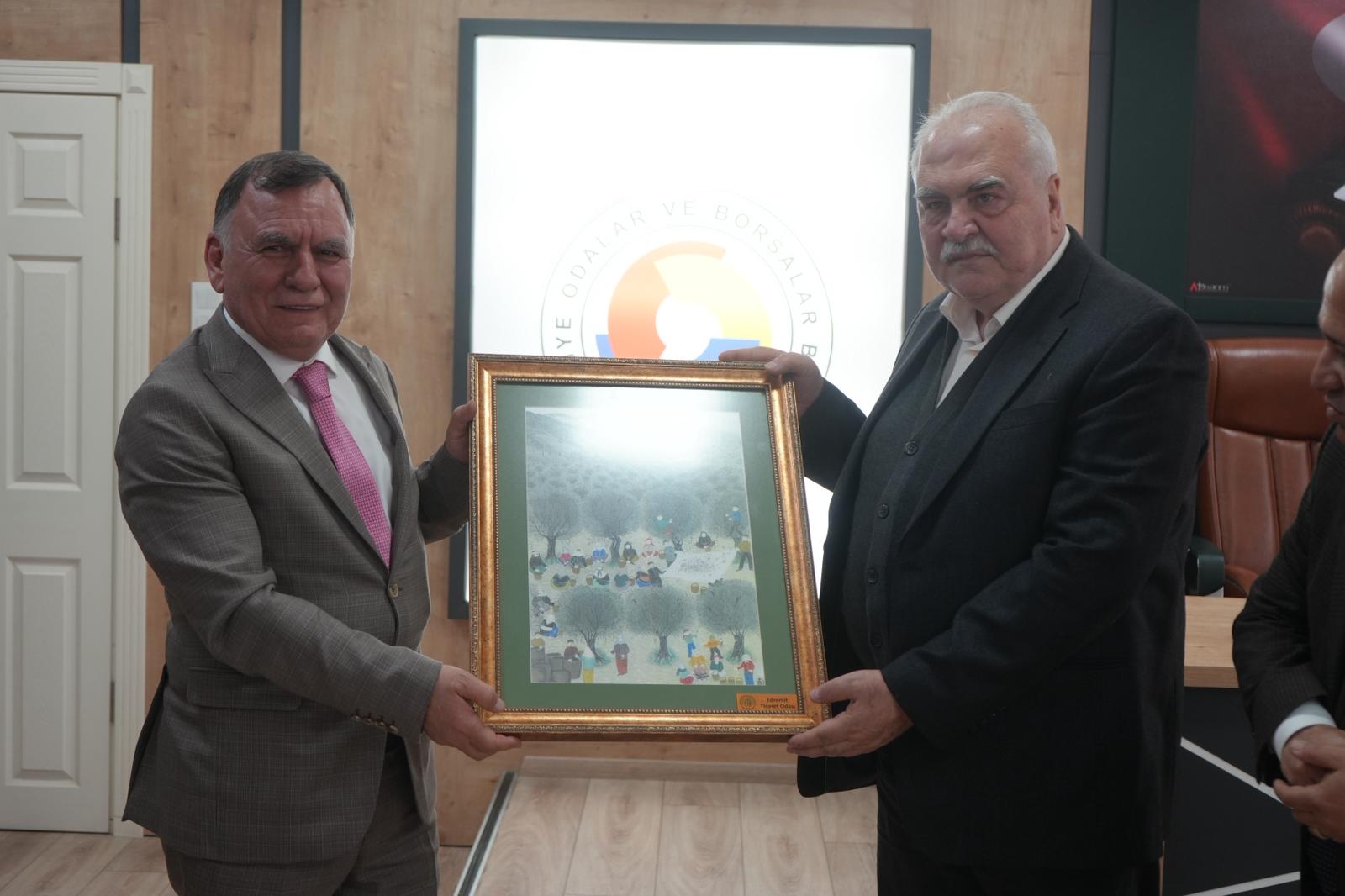 Teknik gezinin üçüncü durağı olan Edremit Ticaret Odası ve Edremit Ticaret Borsası ziyaretinde, bölgenin zeytincilik faaliyetleri açısından taşıdığı stratejik önem ve bu alandaki ekonomik katkısı vurgulandı. Edremit Ticaret Odası Yönetim Kurulu Başkanı Ahmet Çetin ve Meclis Başkanı Bayram Karahan ile Edremit Ticaret Borsası Yönetim Kurulu Başkanı Abdurrahim Tarkan Denizer tarafından kurumların yürüttüğü faaliyetler, projeler ve sektöre sağlanan destekler hakkında kapsamlı bilgilendirme yapıldı. Ayrıca bölgede zeytin ve zeytinyağı üretiminin geliştirilmesine yönelik çalışmalar, üreticilerin karşılaştığı güncel sorunlar ve çözüm önerileri üzerine karşılıklı görüş alışverişinde bulunularak, sektörel iş birliğinin önemi bir kez daha ortaya konuldu. Ziyaret kapsamında, Meclis Başkanı Bayram Karahan tarafından Borsamız eski Meclis Başkanı Ersin Koç’a ziyaret anısına minyatür sanatına ait bir tablo hediye edilirken, Yönetim Kurulu Başkanı Ahmet Çetin tarafından Borsamız Yönetim Kurulu Başkanı Can Ata Tan’a zeytin ağacından yapılmış, zeytini temsil eden bir tablo takdim edildi. Program kapsamında ayrıca Oda ve Borsa bünyesindeki laboratuvarlar gezilerek tadım ve duyusal testler değerlendirildi yapılan analizler hakkında bilgi verildi.