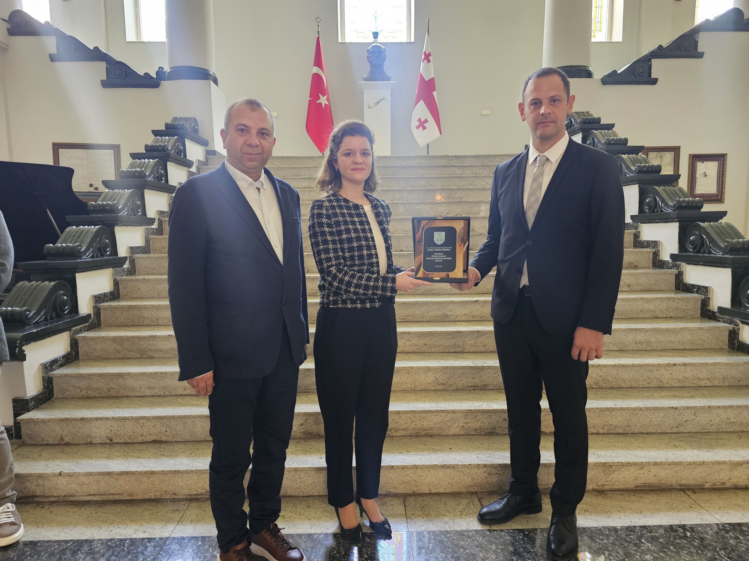 Gürcistan’ın başkenti Tiflis’te tarım ve gıda ürünleri iş birliklerini güçlendirmek amacıyla temaslarını sürdüren Borsamız heyeti Türkiye Cumhuriyeti Tiflis Büyükelçiliği’ni ziyaret etti. Bandırma Ticaret Borsasını ağırlamaktan dolayı memnuniyetini dile getiren Tiflis Büyükelçimiz Ali Kaan Orbay, “”Türkiye ve Gürcistan arasında var olan güçlü bağları daha da ileriye taşımak adına bu tür temaslar büyük önem arz ediyor. Özellikle tarım ve gıda ürünleri alanındaki iş birliklerinin derinleşmesi, her iki taraf için de büyük kazanımlar sağlayacaktır. Büyükelçilik olarak bu süreçte her türlü desteği vermeye hazırız” diye konuştu.