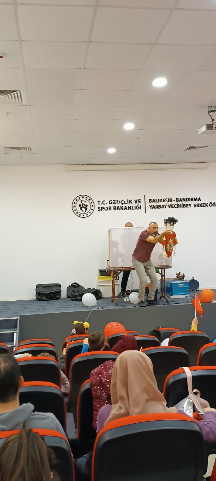 Deprem bölgesinden şehrimize gelen ve Kredi Yurtlar Kurumu Yarbay Vecihibey Erkek Öğrenci Yurdu’nda kalan depremzede çocuklar için etkinlik düzenledi. Bu etkinlikte kukla ve Karagöz-Hacivat oyunları sergilendi. Gösteri sonrasında çocuklar ile birlikte kukla yaparak etkinliği bitiren Bandırma Ticaret Borsası Genç Girişimciler Kurulu bu etkinliklerin devamının geleceği belirttiler. Yapılan birbirinden keyifli oyunlarla çocuklar eğlenceli bir gün geçirmiş oldular.